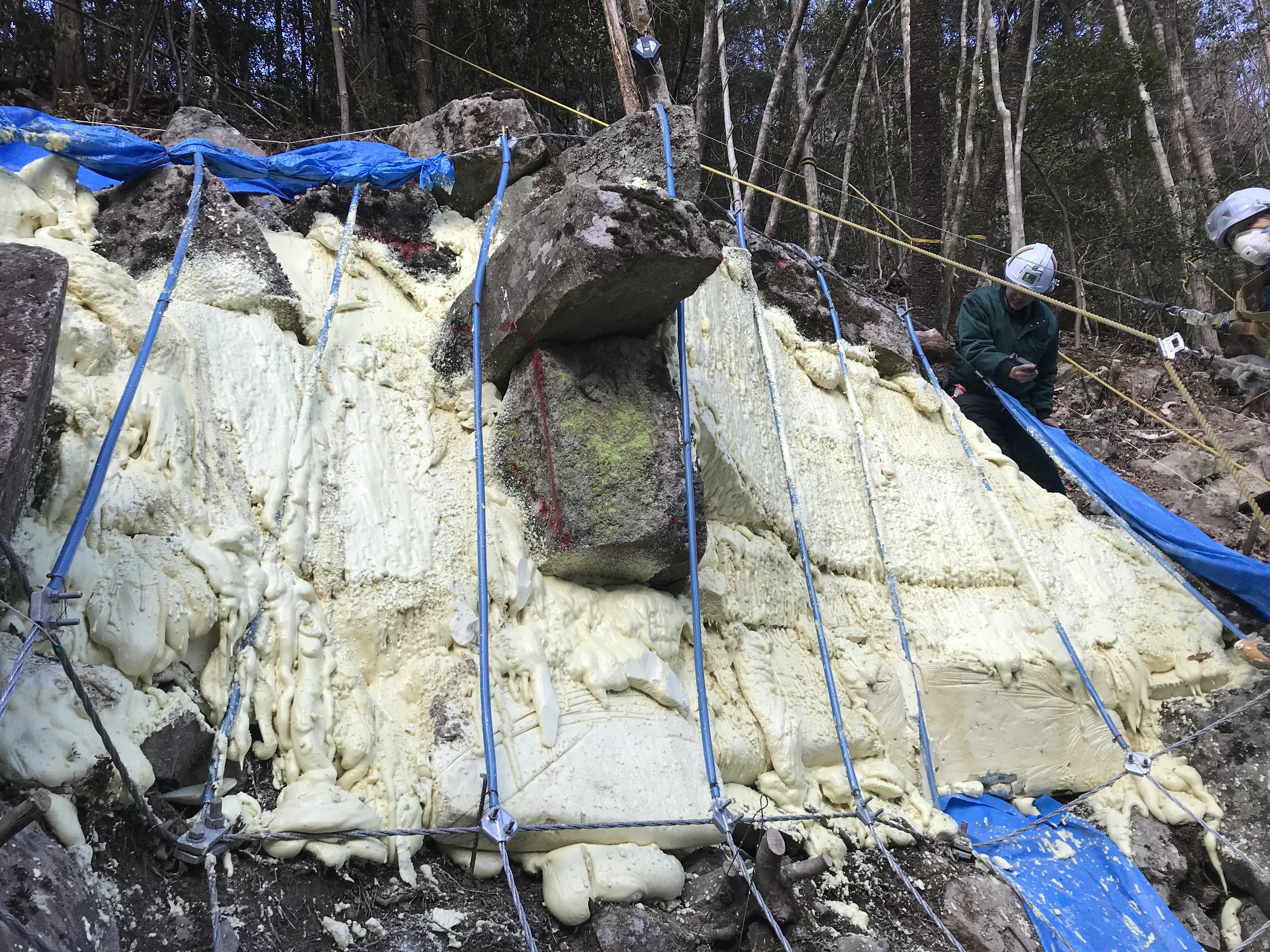 本工法は、発生源での落石を防止する落石予防工として開発した技術です。本技術の活用により、落石郡隙間を現場発泡ウレタンで充填し、複数の石をまとめて石塊を成形し地山に固定できるため、落石の発生リスクを根本から低減します。